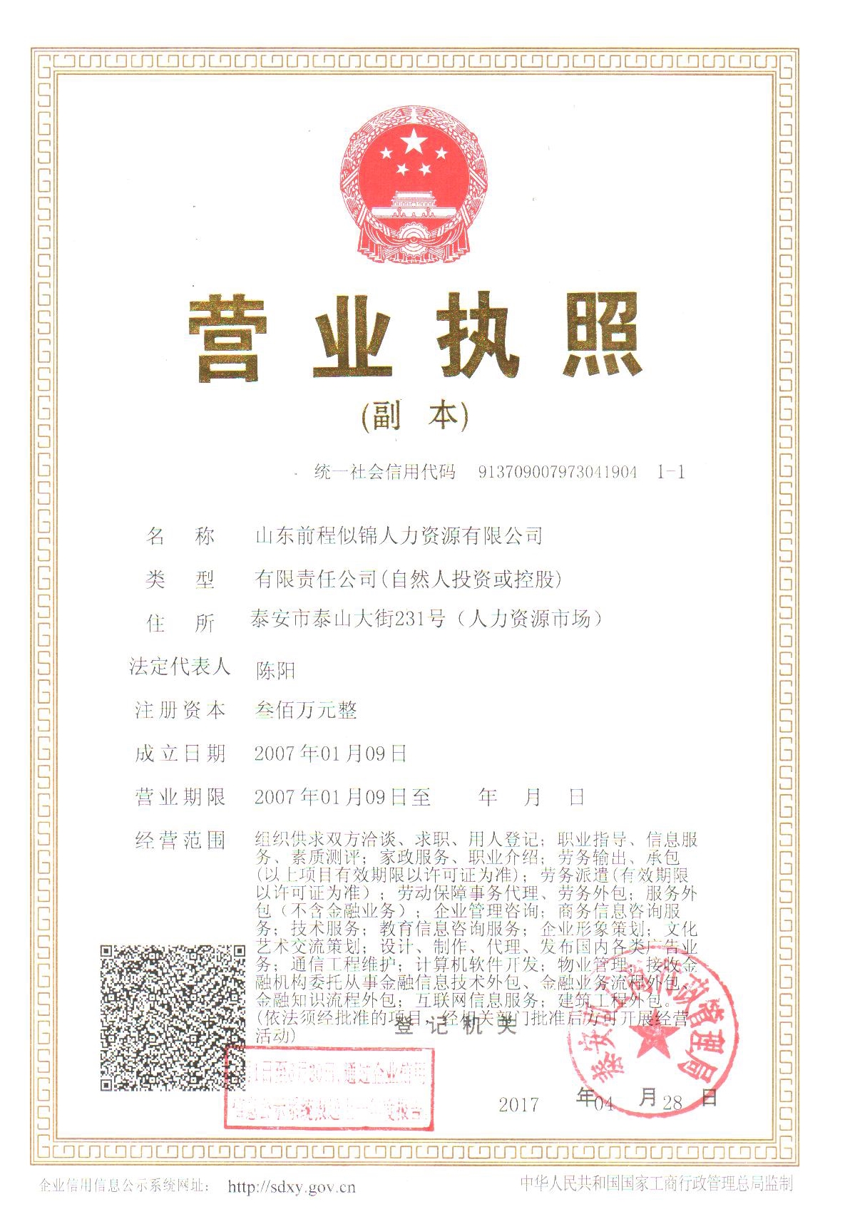 山東前程似錦人力資源有限公司成立于2007年1月,注冊(cè)資本1000萬(wàn)元,公司注冊(cè)地為泰安市風(fēng)景名勝區(qū),目前已在濟(jì)南市等16個(gè)地市設(shè)有分公司(辦事處),在北京、上海、天津等地設(shè)有駐在機(jī)構(gòu)。